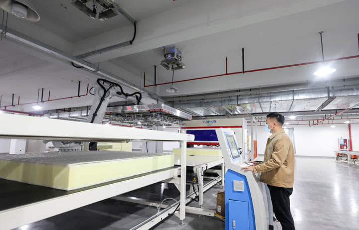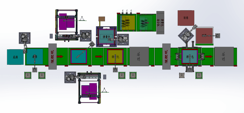 ·自动上料:底 / 顶层海绵由托盘到指定位置,系统自动完成分棉、上料;