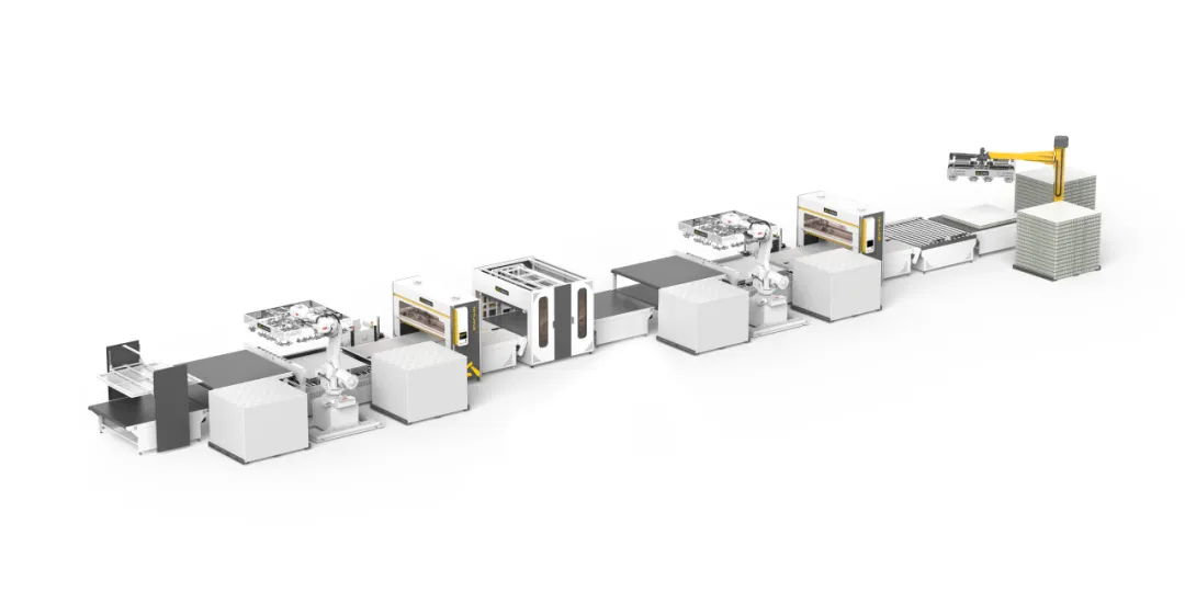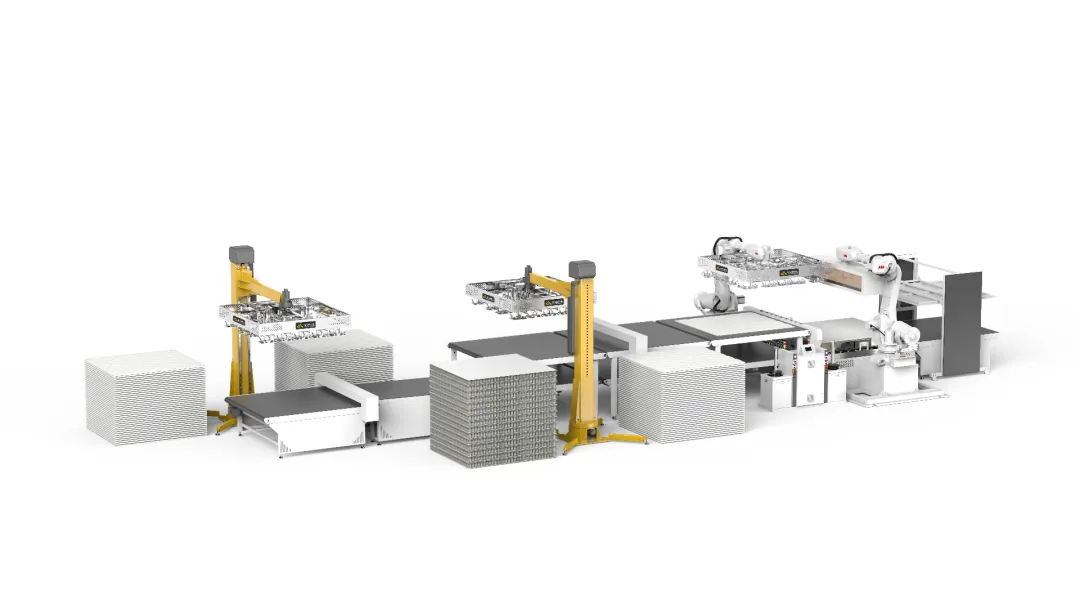床网、顶/底层面料及海绵等填充层由AGV送到指定位置,系统自动完成拆分、上料